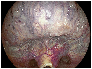 Suction, irrigation, and insufflation are all possible with this trans-nasal flexible endoscope, which facilitates the clinical assessment of this particular area. The tip of the endoscope can make a U-turn up to an angle of 210°. We previously reported the usefulness of the intra-oropharyngeal U turn method.7‒8 We were able to observe all areas of the tongue from the base (Figure 2A) to the apex (Figure 2B) and a frontal view of the papillae vallatae was obtained in all patients. The squamous cell carcinoma of the base of the tongue detected by EG-L580NW is shown in Figures 3A (white light imaging) and 3B (LCI). After completing the intra-oropharyngeal U-turn method, the tip of the endoscope is inserted gently between the epiglottis and the tongue to observe the vallecula and the tonsil side of the epiglottis.