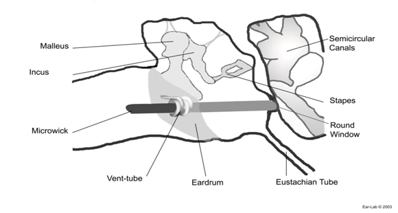 The Silverstein Microwick is made of a polyvinyl acetate material and measures (when dry) 1mm by 9 mm. It can be inserted under local anesthetic in a non-certified office surgery room, is cheap and appears to be well tolerated whilst in-situ. Insertion involves performing a tympanotomy over an estimated position of the round window niche. A ventilation tube is inserted through the tympanotomy and a wick is inserted into the tube, with its tip placed into the round window niche. Medication drops are placed onto the Microwick and it is allowed to expand. The patient then self-administers medication to the ear canal. When the medication contacts the proximal end of the Microwick it becomes saturated with the medication and the medication travels to distal end under capillary action. As distal end is in contact with round window membrane, the medication permeates the round window and is absorbed into the inner ear fluids.