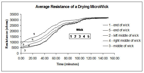 See Figure 2. The maximum resistance is reached by all parts of the Microwick at approximately 105-110minutes. At this point in the drying process the Microwick is reduced to its original size and is dry and “crispy” to the touch. At 85% humidity, the Microwick took about 400minutes to reach 33kilo ohms. This is over 3.5times as long as the control experiment at 70% humidity. By way of comparison, the humidity within the ear canal of a human subject measured with our device was 70%. Based on electrical impedance, the laboratory dry time for the microwick was determined to be approximately 70minutes. After application of the heat source the wick became completely dry after only 7minutes. Adding 3 drops to the microwick after one hour increased the drying time by 100minutes.