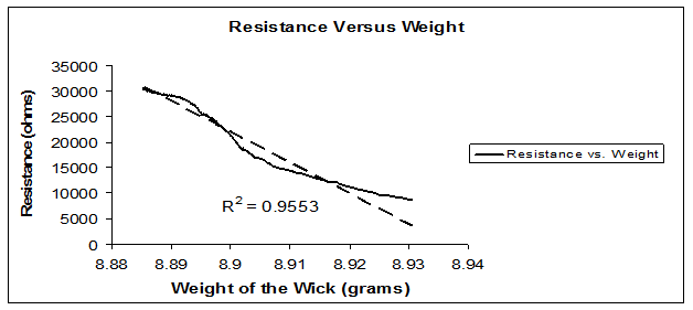 Setup and Procedure: The basic resistance test was run. When segment 5 of the microwick reached a resistance of 8 K ohms a piece of filter paper (Fisher Scientific P8), with a known mass, was held to one end. The filter paper was held by a clamp on a stand. The pressure applied was slight, so that the Microwick was just touching the filter paper. The filter paper was allowed to absorb liquid from the Microwick for 30seconds, after which the filter paper was immediately weighed to avoid further evaporation. The weight of medication transferred to the filter paper was then calculated. This value was akin to the drug availability at the rwm end of the wick. This constituted one trial. A new trial, using a new wick, was commenced but this time the availability at 10K ohms was calculated. Further trials at successive 2k ohms increments were conducted until a point was reached were no fluid was imparted onto the filter paper. We were therefore able to map out drug availability at the rwm end of the microwick at various segment 5 electrical impedances. In addition to testing the behavior of the microwick, we ran several tests on liquid medications used through the microwick.
