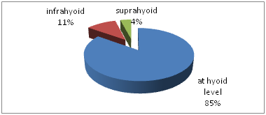 Fourty one (85%) patients have swelling adjacent to hyoid bone, 2 (4%) patient had swelling above the level of hyoid bone, while 5 (11%) patient presented with swelling between hyoid and thyroid gland (Figure 4).