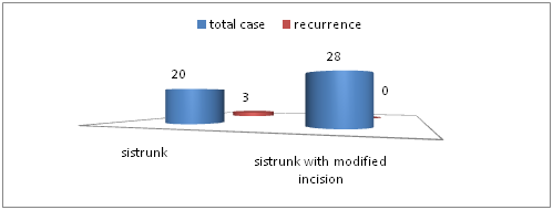 There was no significant difference in the rate of complications and operative time of the procedure between the two procedures. There was statistically significant difference in recurrence rate in sistrunk procedure (3/20) as compared to sistrunk procedure with modified incision (0/28) (P = 0.04).