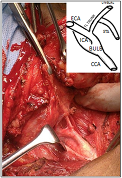 Figure 1 Intra operative picture showing carotid system dissected on right side with selective ligation of superior thyroid artery from thyrolingual trunk during skeletonisation of larynx prior to laryngectomy. Inset- Schematic representation of the anatomy in the inset with labelling. Abbreviations: CCA, common carotid artery; ICA, internal carotid artery; ECA, external carotid artery; STA, superior thyroid artery; LINGUAL, lingual artery; TL, trunk thyrolingual trunk.