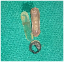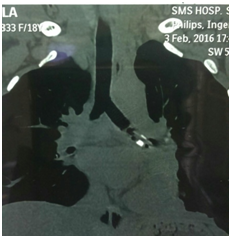 Case 1: An 18 girl aged 18 gave a history of 13 years of cough, which had recently become more troublesome with mucopurulent sputum. She had been attending a rural health center for the cough for several years. Radiographs were normal initially. Subs X Rays showed obstructive emphysema on the left side. She remembered swallowing a whistle when she was much younger (around 5 years of age). Before the diagnostic bronchoscopy, a computed tomography (CT) was performed that revealed a soft tissue density in the left main bronchus (Figure 1). Rigid bronchoscopy performed a plastic whistle successfully Retrieval was by under general anesthesia. (Figure 2) There was considerable granulation tissue around the FB.