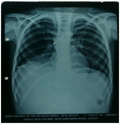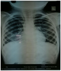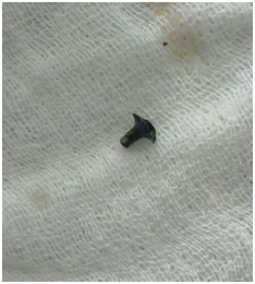 Case 2: A 5 year old girl reported to the hospital with history of chronic cough since 2 years; she had episodes of recurrent URTI. There was no history of FBA. She had been treated many times by physicians for acute bronchitis in this period and experienced temporary relief after medication. She had diminished chest movement on the right and dullness to percussion was elicited on the right as well. She had a markedly diminished breath sound over the right lung field. Chest X ray was advised which showed a radiopaque object lodged in the right main bronchus with resultant atelectasis of the entire left lung and compensatory emphysema of the right lung (Figure 1) Bronchoscopy revealed a black metallic stud in the right main bronchus. a mass of granulation tissue surrounded the body (Figure 3) (Figure 4) (Figure 5).