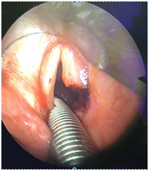 In our study, all patients had a tracheostomy tube insitu before CO2 laser cordectomy. Yet this procedure can be safely done without a tracheostomy and may avoid doing one. In fact, endoscopic management of BVCP whether CO2 laser cordectomy or arytenoidectomy has proven to be more cost effective on the long term compared to tracheostomy.9 Endoscopic management of BVCP without tracheostomy can be performed with suspension microlaryngoscopy with spontaneous ventilation, apneic technique, or using laser safe metallic endotracheal tubes (Figure1). Laser cordectomies can be performed simultaneously on both vocal cords. Olthoff and Steiner have showed that this bilateral technique combines excellent airway improvement and satisfactory voice preservation.10