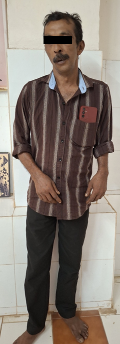 Figure 1 Clinical photograph showing asymmetry of the upper limbs, with the left upper limb appearing shorter than the right and exhibiting limited elbow extension. The lower limbs are of normal size with mild bowing observed in both legs. Fingers appear normal in size, shape, and number, with no visible signs of clubbing or cyanosis.