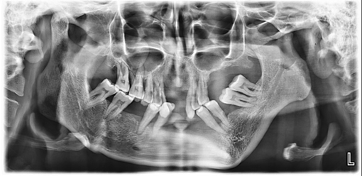 Figure 4 Orthopantomogram showing mandibular asymmetry with hypoplastic left condyle, reduced vertical height of the left ramus, and a prominent antegonial notch. Cortical bone and mandibular border are intact with normal bone density. The left glenoid fossa appears normal; the right mandible is structurally unremarkable.