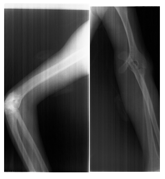 Figure 5 Radiograph of the left upper limb showing bony ankylosis of the elbow joint with hypoplasia of the ulna and proximal radius, resulting in an elbow flexion deformity.