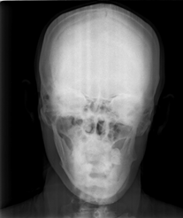 Figure 7 Posteroanterior skull view revealing hypoplastic maxilla, prominent antegonial notch, and mandibular deviation to the left side.