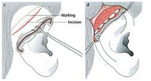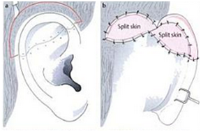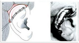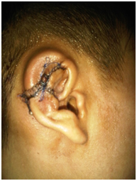 The patient was planned for second stage surgery. There are few technique for elevating the auricle. In one literature stated that the Nagata method is better for the second stage surgery other than Ombredanne’s and Crikelair’s, but there are no evidence based that support this statement. Nagata technique begin with Incision of full thickness skin flap pedicled on the helix about 8-10 mm in width is elevated above the helix and above the hair follicles in the direction of helix, leaving some fibrous tissue on the helical cartilage. Next the entire post auricular surface and the mastoid surface covered with thick split- or full thickness skin graft taken from thorax donor site, the groin area or buttocks. The skin graft is secured with sutures and fibrin glue (Figure 11).7