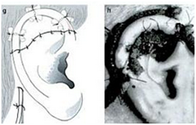 The first stage operation was implantation of the cartilage framework. The skin incised about 3-4 mm lower than the marked height of the stump.7,8 Subcutaneous pocket is developed, about 1 cm larger than the height of the superior helical margin and the post auricular stump skin is sutured to the lower margin of the incision. The framework is attached using 5.0 braided suture and inserted to the pocket. Closure of the skin wound, vacuum drainage, and mattress sutures (Figures 7-10).7