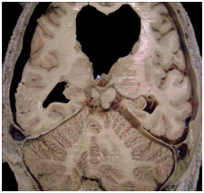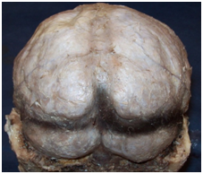Figure 1 Cadaveric dissection. Posterior view of the head without the cranial vault showing dura mater in supra and infra tentorial floors and the origin of the lateral sinuses at the level of the confluence sinnum (Prensa de Herofilo).