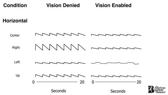 Figure 1 Gaze testing evidenced right-beating nystagmus with all eye deviations. Vision enabled conditions evidenced suppression of nystagmus. These findings are commensurate with an uncompensated left peripheral vestibulopathy.