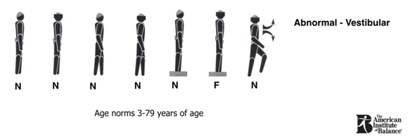 Figure 2 Gans SOP test results are normal in conditions 1-5 and 7 with a fall (denoted as “F”) in condition 6. This pattern is remarkable for an uncompensated peripheral vestibulopathy.
