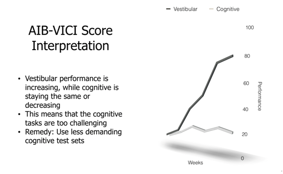 The AIB-VCI protocol is effective because it uses well-established tenants of concussion rehabilitation for both cortical and labyrinthine concussions. Experts agree that demanding rehabilitation sessions can lead to a lack of progress being made for cognitive function.1 However, this is not the consensus on vestibular rehabilitation, where the opposite is true: the more demanding the rehabilitation session, the better, and faster, the positive outcome.2 We now have a dichotic problem that has, for the most part, traditionally been managed with a single strategy, be it complete rest, or intense intervention, both are likely to fail. The AIB-VCI can differentially adjust for difficulty of training sessions on two levels. Namely, vestibular task difficulty and cognitive task difficulty. Thus, we can compensate for a patient who may need less demanding cognitive training but more intense vestibular training, while still making progress in both areas. The risk of not differentiating the diagnosis and management of labyrinthine from cortical concussion can go beyond a lack of progress being made. Too intense, or too time-consuming, cognitive load can create a cascade of events in the central nervous system that lead to neuronal cell death.3 Tau protein and increased ventricle size then take up the space where neurons were once present and the patient is left with a permanent neurological change. If this keeps happening with either repeated head trauma or a lack of adequate cognitive rest, a condition called Chronic Traumatic Encephalopathy (CTE) develops.4 This leads to permanent structural and functional changes, including diminished cognitive performance beyond that of the head impact itself.3,4 As such, having a management strategy that allows for constant modification of vestibular and cognitive training independently, while still completing both tasks in a timely manner, is of utmost importance. The AIB-VCI was designed for this purpose.