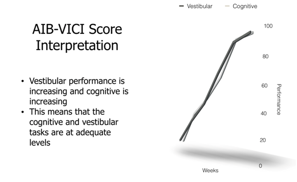 Figure 6 This graph illustrates the intended results of the AIB-VCI. The patient has centrally compensated for the unilateral peripheral vbestibulopathy and has reached his age-corrected normative cognitive scores. Thus, the patient has been successfully rehabilitated for his cortical and labyrinthine aspects of the concussion.
