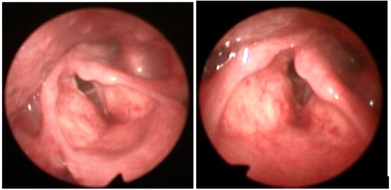 Figure 1 Left vocal cord palsy as seen on transnasal laryngoscopy-the left VC is in paramedian position with anteroposterior shortening of the left aryepiglottic fold.