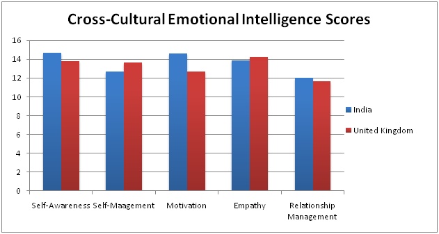 Evidence demonstrates that an increase of emotional intelligence levels leads to work productivity and effectiveness. Within this study, emotional intelligence levels were examined for United Kingdom and Indian teacher practitioners. Teacher practitioners were instructed to complete a self-report measure of emotional intelligence following email contact. Results demonstrate that cross-cultural emotional intelligence scores were moderately high for teacher practitioners of the United Kingdom and India. Further, overall scores demonstrated that female practitioners scored higher in emotional intelligence than male practitioners. In relation to gender differences it was also evidenced that male and female Indian practitioners scored higher in emotional intelligence than those from the United Kingdom. In addition, emotional intelligence data for age identified that maturity and experience led to higher scores. The sub-domain of self-awareness was integral to the relationship between increased emotional intelligence and other associated sub-domains. One limitation of the research resonates to the use of a predominant quantitative design. Future research should focus on adopting a qualitative methodology that would enable greater depth and regression analysis.