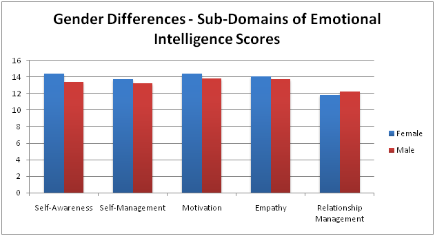 Emotional intelligence scores for gender reported that females outscored males on four of the five sub-domains equating to 90% of the data. Previous research (e.g., Brackett & Mayer 2003; Ciarrochi et al. 2000) has supported the notion that females report higher levels of emotional intelligence than males. Although there is considerable debate on which on which specific emotional intelligence dimensions females perform better (e.g. Livingstone & Day 2005; Farrelly & Austin 2007; McIntyre 2010; Day & Carroll 2004). Therefore, implementing a meta-analysis would be useful in context when assessing relationships between gender scores and emotional intelligence scores. A meta-analysis performed by Joseph & Newman2 highlighted that females obtained higher scores than males on emotional intelligence dimensions. Assessing data from the current study identifies that both female and male teacher practitioners from India scored higher in emotional intelligence than those from the United Kingdom. Although caution should be taken with the interpretation of gender scores there is useful information in attempting to understand the relationship between emotional intelligence differences and gender.
