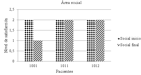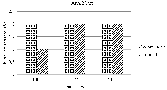 This section explains how twenty-three people with a previous diagnosis of paranoid schizophrenia participated, who receive treatment and are treated in the Centro Integral de Salud Mental (CISAME) in Cuautla, Morelos. With respect to the application of the Valencia et al.1 tests it was found that those participants who met all the inclusion criteria established in the study showed a different perception within their areas, changing their behavior, perception and, mainly, the style and quality of life in which the patients were. We measured, according to the tests, the five main areas in which the affected patient is located, demonstrating in such a way the change in their behavior and the impact on their lives according to the results obtained. The work area showed that, in spite of perceiving it as satisfactory, not only was this position maintained at the end of the investigation but, unlike the beginning, they were able to explain and justify their level of satisfaction instead of just relying on monosyllabic responses like “yes” and “no”. This represents, to a certain extent, that patients were able to maintain their work and improve their performance in it thanks to the knowledge and skills developed during the course of the intervention, allowing the subject to understand their limits and abilities as well as to potentiate the necessary skills for the understanding of their current situation and the possible repercussions, and importance, in the future for themselves of those around them. Therefore, the fact that they could measure their own context in the work area allowed some measure to use it as an occupational therapy, at the same time as developing (or obtaining) tools that allow the patient a better adaptation to the environment that surrounds him, fostering social and work relationships, in addition to the sense of commitment and importance of having and maintaining a job for his own personal and family well-being. It should be emphasized that these same patients are the ones who expressed, understood and could explain the reason why this area is necessary in their life. Therefore, it was found that in the work area, patients 1001, 1011 and 1012 (who met all the inclusion criteria of the research) are those who represent the changes in the work area in this way mentioned above (Figures 1−6).