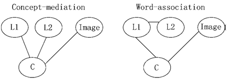 Research on bilingual knowledge and language organization raises a general question about language storage – specifically, do bilinguals use a single common store for the meanings of words in the two languages or do they have two separate stores. The Separate Storage Model assumes two separate language-specific representational systems.16 Each of the words in a translation pair has its own conceptual representation. The separate storage model stands in contrast with three other models that emphasize shared storage; the Concept Mediation Model postulates that there is a single language – neutral representation for each concept and that L2 words access this representation directly.17 Translation from one language to the other is mediated by access to this common store. In contrast, Word Association Model holds that bilinguals access the meanings of L2 words through their L1 translation equivalents (Figure 1).17