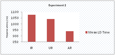 As in Experiment 1, any responses that took less than 300ms or more than 3000ms were regarded as outliers. No data were excluded for this reason. Trials in which the subjects were unable to correctly identify the prime target stimuli were excluded from the analyses. This procedure identified 2% of the trials. In addition, probe target LD errors were excluded from the analyses. It is worth mentioning that the prime naming task error rate in Experiment 1 of the present study (17%) is exceptionally high as compared with the corresponding error rates in Experiment 2 of the present study (2%) and in Neumann et al.29 Experiment 1(4%) and 2(2.25%). This unusually high error rate in prime naming for Experiment 1 more conclusively suggests that the subjects had to scrutinize both targets and distractors a bit too much in order to distinguish between them. In other words, the prime distractors had actually undergone some attention processing instead of being selectively ignored. These likely accounts for the trend toward facilitation observed in the IR condition in Experiment 1 of the present study.