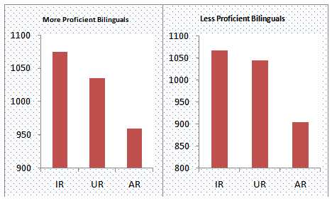 Figure 5 Mean response latency (ms) as a function of the attended repetition (AR), the unrelated (UR), and the ignored repetition (IR) for more and less English proficient bilinguals.