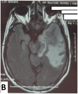 Figure 1 Cerebral MRI in coronal T2-weighted image (A) and axial Flair-weighted image, showing heterogeneous decreasing signal intensity with variable sizes corresponding to necrosis area, surrounded by increased signal intensity corresponding to peri lesional edema with mass effect on the ipsilateral ventricle.