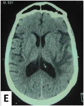 53 years-old man in good health, had a previous history of monocular traumatic amaurosis. In 2008, he was diagnosis as having a nasopharyngeal cancer. He was treated by chemotherapy then 33 courses of external radiation therapy, delivering 2 grays in each one. The evolution was favorable with loco-regional tumor control, apart from sequelar bilateral hypoacusis under hearing aid. 6 years after, he presented rapidly progressive symptoms evolving 15 days before his admission. He reported dizziness, with balance disorder, associated to mnesic complaints interesting the verbal memory. He also remarked phasic disorders with difficulties in finding the right words. There was no sign of intracranial hypertension, seizure, fever or other extra-neurological symptoms. Clinical examination found consciousness patient, oriented in space and time, with stable hemodynamic parameters. The neck was supple, with no paresis but a right Babinski. The Romberg was positive and lateralized to left with horizontal nystagmus, bilateral hypoacusis, and right monocular cecity. The mini-mental state examination (MMSE) showed no abnormality, nevertheless the Montreal Cognitive Assessment (MoCA) score was 24/30, with three lost points in memory, two points in attention study and one point while naming. The somatic examination showed no other abnormalities. The clinical syndrome was pyramidal irritation, with dementia and left vestibular syndrome.