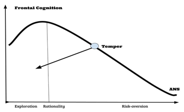 The curvilinear relationship in Figure 1 identifies Risk-willingness (Temper) with these basal correlations: Car driving (r=0.49), Financial matters (r=0.50), Careers (r=0.61), Sports/leisure (r=0.56), and Health (r=0.48) [Dohmen et al., 2012]. This identifies risk-willingness (Temper) with moderation as a performance optimum as a basal parameter of human behavior.