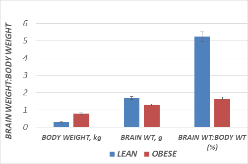 The physiologic or metabolic basis for the differences in brain weight and composition are unclear, but are highy suggestive of chronic hyperinsulinemia as contributing factors. Elevations in plasma insulin have been reported to occur through much if not the entire lifespan of the obese phenotype of this strain, and which contribute to the impaired thermogenesis in response to factors of diet and environment, including insulin inhibition of UCP1 actions in brown adipose tissue (BAT).28–30 The BAT is a primary tissue in expressing nutritionally and environmental increases in thermogenesis, and when impaired due to metabolic aspects of insulin resistance in BAT and other peripheral tissues, results in increased rates of lipogenesis and body fat accretion in both visceral and subcutaneous adipose tissue depots.29,30