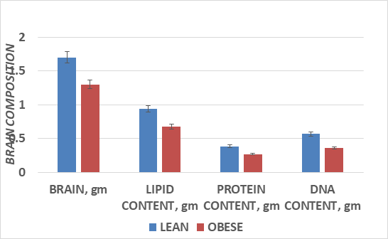To determine if the obese phenotype impacted on brain development and composition, groups of congenic male lean and obese littermates of the LA/Ntul//-cp rat strain were fed on a standardized nutritionally adequate diet in littermate pairs from weaning until adulthood. The obese phenotype of his strain develops early onset chronic hyperinsulinemia associated with hypertrophic-hyperplastic obesity during early postweaning growth. At 10.5 months of age, animals were sacrificed by cervical dislocation, and brain tissues excised in its entirety, weighed to the nearest mg, and measures of protein, DNA and lipid determined. Body weights (BW) of obese were significantly greater than lean. Brain mass (BrM) of lean > obese, and BrM:BW of lean was greater obese. Brain protein content (BPC) and Brain DNA (BDNA) of lean was greater than obese. Brain lipid as a percent was similar in both phenotypes and net brain lipid content was proportional to brain mass. Total body fat mass of obese was significantly greater than occurred in lean littermates. Inflammatory cytokines residing in adipose tissue have been reported to contribute to DNA damage in neuronal and other tissues, impede cell replication, and accelerate cell senescence. These results indicate that brain growth and cellular development is impaired in the hyperinsulinemia-prone obese phenotype of this strain, and are likely associated with development of a chronic inflammatory syndrome and cytokine expression common to excessive fat accretion and obesity.