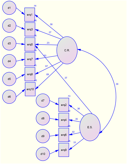 Based on the results of the exploratory factor analysis, a confirmatory factor analysis (CFA) was conducted with maximum likelihood estimation method. A two factor model was specified in which ERQ items 2, 4, 5, 6, and 9 loaded onto the latent variable of Emotional Suppression, and items 1, 3, 5, 7, 8, and 10 loaded onto the latent variable of Cognitive Reappraisal. Item 5 was allowed to cross-load on both latent variables, and no correlated measurement error was assumed in the model. For model specification, Emotional suppression (ERQ 2) and cognitive reappraisal (ERQ 1) were used as marker indicators for Emotional Suppression and Cognitive Reappraisal respectively. Emotional suppression and cognitive reappraisal were allowed to correlate since exploratory factor analysis indicated a positive relationship between the two latent variables. The model was over identified with 33 df.