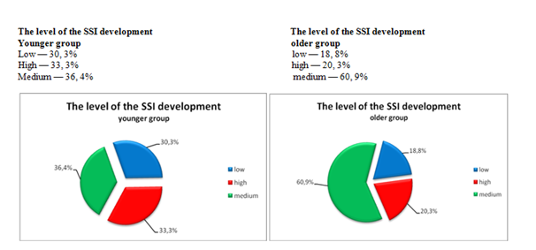 With a medium level of spatial self-awareness we observed uneven results in different spheres. Pro-active attitude and focus on different experience is unequal. Such children are predominantly active during self-movement sense tests but may miss some space objects or elements of sign games. They compensate for imbalance inaccurately or with a delay and need a safety net during balance tests. For toddlers aged 1.6 to 2.5 years the medium level was estimated at 54 to 84 points, for children aged 2.6 years and older— 60 to 97 points. Children with a low level demonstrate low results in focused activity and bodily senses development in each sphere of the research. Such children avoid many actions and effects during sense of touch tests; their motor activity is not related to the task in any way. During self-movement tests fitting in space show a dramatic decline, children do not account for the environment, bump into objects, and their imitation is occasional and feebly expressed. During balance tests such children are highly insecure, they hold on to the safety net tightly. The unpredictability or absence of visual control can reduce their activity to zero. A low level of a spatial self image development was recorded in cases when the total figure was below 53 points for toddlers and 59 for the older group of children. Following the diagnostics testing the results in terms of development of a spatial self image are as follows: 27% of children have a high level, 49% — medium, 25,5% — low level (in the total sample). We observe significant differences in the older and younger age groups in terms of the distribution of the SSI levels (Figure 1). While the younger group has quite an even distribution, with aging the proportion of children with a high level drops almost three-fold, the proportion of children of medium level increases nearly twice and the proportion of low level reduces just by a third.