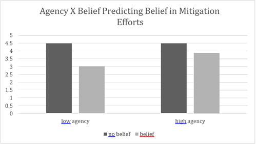 For the mitigation variable, when analyzing the low agency group independently, it was found that the non-belief group (M = 4.34, SD = .80) was statistically higher than the belief group (M = 3.06, SD = .77), F (1, 50) = 20.95, p < .001. When analyzing the high agency group, it was also found that the non-belief group (M = 4.40, SD = .69) was more likely to believe that mitigation efforts could be successful than the belief group (M = 3.87, SD = 1.01), F (1, 51) = 4.11, p = .048, however this difference was more striking for the low agency group than the high agency group.