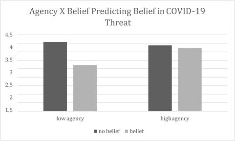 Agency by belief in conspiracy effects: The interaction between agency and belief group was significant for both belief in mitigation, beta = .66, p = .016, and belief in threat, beta = .77, p = .007. See Figures 1 and 2 for graphical depictions of these interactions. In order to probe these effects further, the simple effects were analyzed separately by level of agency. A median split was used to separate those relatively high in agency from those who were relatively low.