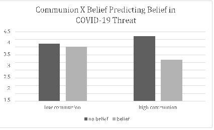 This pattern indicates that a lack of belief in conspiracy theories coupled with a high level of communion is predictive of the strongest belief that COVID-19 represents a real threat to well-being, whereas any level of belief in conspiracy theories erases this benefit of communion.