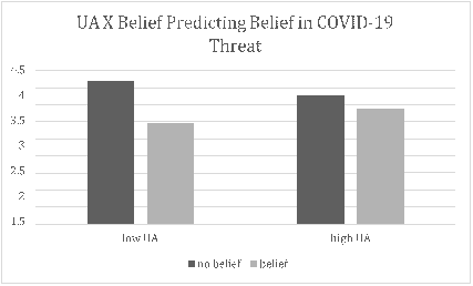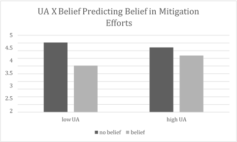 UA by belief in conspiracy effects: The interaction between UA and the belief group was significant for both belief in mitigation, beta = .64, p = .037, and belief in threat, beta = .63, p =.046. See Figures 4 and 5 for graphical depictions of these interactions. These effects were again analyzed separately by level of UA with a median split being used to separate those relatively high in UA from those who were relatively low. For the mitigation variable, when analyzing the low UA group independently, it was found that the no belief group (M = 4.53, SD = .50) was significantly higher than the belief group (M = 3.03, SD = .82), F (1, 48) = 44.42, p < .001. When analyzing the high UA group however, it was found that the no belief group (M = 4.21, SD = .90) was only marginally significantly higher than the belief group (M = 3.69, SD = 1.00), F (1, 53) = 3.07, p = .085.