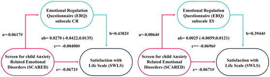 Figure 2 The mediating effect of emotion regulation (CR on the left, and ES on the right) in the relationship between anxiety and life satisfaction. Notes: *p<0.05, **p <0.01, # p<0.001, ns >0.05; All presented effects are unstandardized; a is effect of anxiety on emotion regulation; b is effect of emotion regulation on satisfaction life; c´ is direct effect of anxiety on life satisfaction; c is total effect of anxiety on life satisfaction; ab is indirect effect of anxiety through ER.