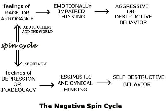 The red bridge connects the negative and positive portions of the upper half of the diagram. Now look at the third option of routines that is labeled "negative about the self" (at the bottom left). A general name for that category is depression or feelings of inadequacy and lack of self-confidence. These associated negative feelings about ourselves seek out and encourage thinking routines that are called pessimistic or cynical. Feelings of depression are actually feelings of rage turned against our own self. Similarly, feelings of inadequacy are actually feelings of arrogance turned against our own self.