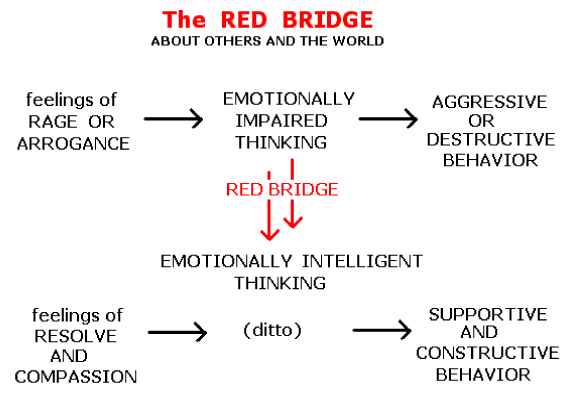 You use the red bridge to cross from negative thinking about others to positive thinking, that is, from emotionally impaired thinking to emotionally intelligent thinking. Our ability to use the bridge technique is part of the socialization process that produces all our habits. The red bridge is crossed by talking to ourselves in a certain way so that we stop thinking negatively about someone or some situation, and start thinking positively. We have the capacity to monitor our thinking and to note that it is emotionally impaired or biased. We can then replace this type of negative thinking routine with more objective and emotionally intelligent thinking routines. Of course to use the bridge we must be motivated to use the positive option that is available. Without that motivation we keep re-running or re-cycling the negative routines of the threefold-self that we have acquired in the past.