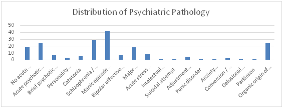 Data was collected and analyzed and the findings were as follows; 22.4% of referred cases labeled as abnormal behavior were not psychiatric cases per se but met the criteria for the diagnosis of Delirium, this result is in congruence with the findings cited in Emergency rooms across the USA were one of five or 20% of all psychiatric patients met the criteria for delirium. Most of the patients were male between 21-40 years old (73%) that also is a realistic reflection of the demographic representation of the population in Qatar and it is similar to other study.1 In this subgroup the Majority of patients were Arab 21%, Indian 16% and Bengali 16%. Among those who were diagnosed with psychiatric illnesses 62% were admitted and 38% got discharged (Figure 1-3).