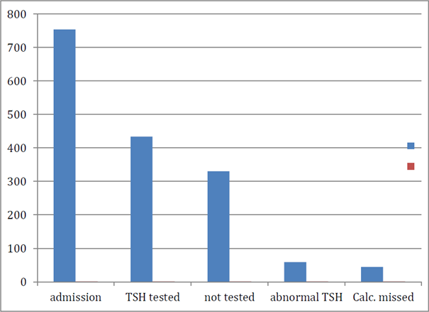 434 were screened using TSH level at the time of admission or 57.5% of all admission; of those tested we found 59patients or 13.6% with abnormal TSH values. Subsequently, if all patients were to be tested then the projected abnormal results would be 93 patients. So, it leads all to conclude that possible abnormal TSH results among the mentally ill in Qatar is about 12.33% of all admissions. Which is higher than what Cohen and Swigar showed of 9% of their admissions.6