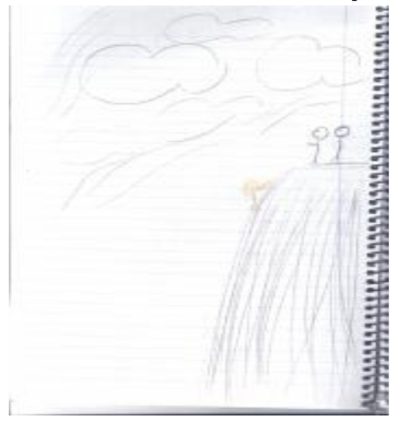 S.'s defense mechanism is escape instead of coping. She does not tell N. to stop reading her personal diary and to get out of her personal space. The situation has to be extremely bad for her to react and be demanding of her own rights; only then did she yell and accuse N. of not relating to feelings. Another male figure that appears towards the end of the dream is M. who represents positive aspects of her animus. M. feels at home, took a shower and appears after the event; he is not in time when his intervention might have made a difference. S. left the room, went outside crying and sat on the grass. The grass represents nature and her connection to the Big Mother archetype. There, on the grass, she can accept M., the positive aspect of her animus. When S. describes the same bordeau colored shirts that she and N. have, we see that S. did not yet individuate. She does not have her own colored shirt, a different color, but she does pay attention to the fact that the shirts have an identical color. A picture that was drawn around the same time shows S and her current boy-friend – they are together but on a cliff and S talks about how insecure she feels – they will both fall off the cliff together. It looks as if they are happy together, looking at the sky, at the future, but in reality they are on the edge of a cliff. She talks about how she does not trust him and cannot depend on him.