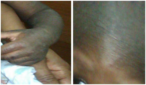 Figure 1 A 7 - Month’s neonatal from Africa showed persistent skin rash and redness of the eye rash of the trunk, limbs and scalp, flushed with oral mucosa and conjunctiva. It was diagnosed generalized atopic skin disorders and severe skin infection caused by cow milk feeding.