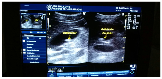 A 8year old girl born to non consanguineous marriage reported to the outpatient department (OPD) with history of acute pain abdomen of 3days duration, speech delay, global developmental delay and squint since birth. She was born at 37weeks of gestation by emergency Lower segment caesarean section LSCS (Indication fetal distress) with birth weight 2.25kg, length 45cm and head circumference 34cm. The baby cried immediately after birth and was started on breast feeds within 4hrs of birth. There were no antenatal risk factors. The initial milestones was delayed (cognitive more than motor). There was history of recurrent lower respiratory tract infection since 2yrs of age which required frequent hospital admission and antibiotics. She developed seizure at 5yrs of age which was managed with anticonvulsant. The MRI (Brain) done at this stage revealed small foci of hyperintensity in T2 weighted image in frontal and parietal region. The EEG was normal. There was no family history of any chromosomal disorder. She was the eldest sibling and other siblings were 3 and 5years old normal for age. Presently she was brought with history of acute abdomen pain on right upper abdomen which was colicky associated with fever with chills and vomiting. The clinical evaluation revealed weight 21kg (5th P) and height 120cm (3rd P) and head circumference 51cm. The Dysmorphic features were doliocephalic head, hypertelorism, Squint, flat bridge of nose, high arched palate, wide spaced nipple, prominent forehead and microcornea on right side and everted umbilicus (Figure 1A & 1B). The vital parameter revealed temperature 102degree Farenheit with pulse 110/min, respiratory rate 30/min, blood pressure 110/70mm Hg. The abdominal examination revealed marked tenderness over right hypochondriac region and other system was essentially normal. She was immediately admitted and was started on IV fluids and antibiotics and sample was sent for complete blood count, biochemistry and was planned for sonography of abdomen. The investigation revealed polymorpho lecucocytosis with normal biochemistry with positive CRP. The thyroid profile was normal. The ultrasonography revealed multiple Gall bladder calculi with largest measuring 18mmx 19mm (Figure 2). The gall bladder was distended and Common bile duct (CBD) was normal. The lipid profile was normal. The Chest radiograph was normal. She was managed with antibiotics and IV fluids and she responded well to conservative management. The Karyotyping (Figure 3) was done in view of dysmorphism and developmental delay which revealed monosomy 18 with translocation 13p 11/18 which was later confirmed by FISH. The hearing assessment test was normal. The Eye evaluation revealed concomitant squint. The Intelligent quotient test revealed score of 60. She was planned for speech therapy and was kept under follow up.