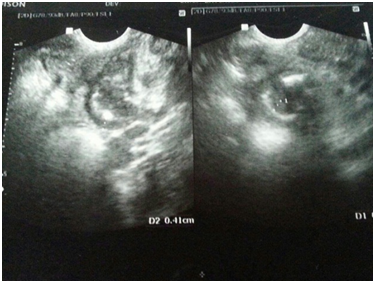 Figure 1 An ultrasound showing, bowel wall thickening with mesenteric lymphadenopathy in the right iliac fossa. The thickened bowel loops showing an angulated intraluminal focus? foreign body.