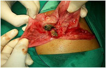 A three year old, male child was brought to the emergency with complaints of pain in abdomen for one day and non passage of stools and flatus for 2 days. There was one episode of bile tinged vomiting on the day of presentation to us. On examination, the child was sick looking, with tachycardia and mild distension of abdomen. The abdomen was guarded and tenderness present in the right para umbilical region along with a vague lump on palpation. An ultrasound was advised which revealed bowel wall thickening with mesenteric lymphadenopathy in the right iliac fossa. The thickened bowel loops showing an angulated intraluminal focus ? foreign body (Figure 1). A Xray abdomen was done which showed an oval foreign body in the mid abdomen overlying spine (Figure 2). The attendents were enquired about possibility of any foreign body ingestion and then they revealed that child had ingested a button cell, 3 days back. In view of these findings and condition of the child, decision to do a laparotomy was taken. Pre-operative routine investigations showed a leukocytosis with WBC counts of 15500 and polymorph count of 89%. Laparotomy was done under general anesthesia. There was a clump of bowel loops present in the right lumber region at the site of palpable lump on clinical examination. After adhesilysis a contained leak of bowel contents along with a perforated meckel’s diverticulum was found. The perforated site was showing a charred circular patch which was stuck up to the adjacent mesentery, which also showed similar charred area (Figure 3). On palpation of meckels diverticulum, a firm circular object was felt, which turned out to be a leaked button cell. This was lodged in the diverticulum, near its apex. The size of button cell was 1 cm x 1 cm. A segmental resection of the meckels was done with end to end anastomosis (Figure 4). The post operative recovery was uneventful. The child was discharged on post op day 7. The child has been in follow up for 2 years now and is doing well. The parents were advised to be carefull with the button cells and keep the child away from them.