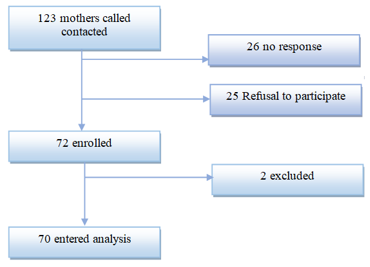 The mothers contacted numbered 123. Twenty-six of them were unreachable, and 25 refused to participate in the study and two were excluded (due to incomplete collection sheets). A total of 70 mothers were recruited (see Figure 1).